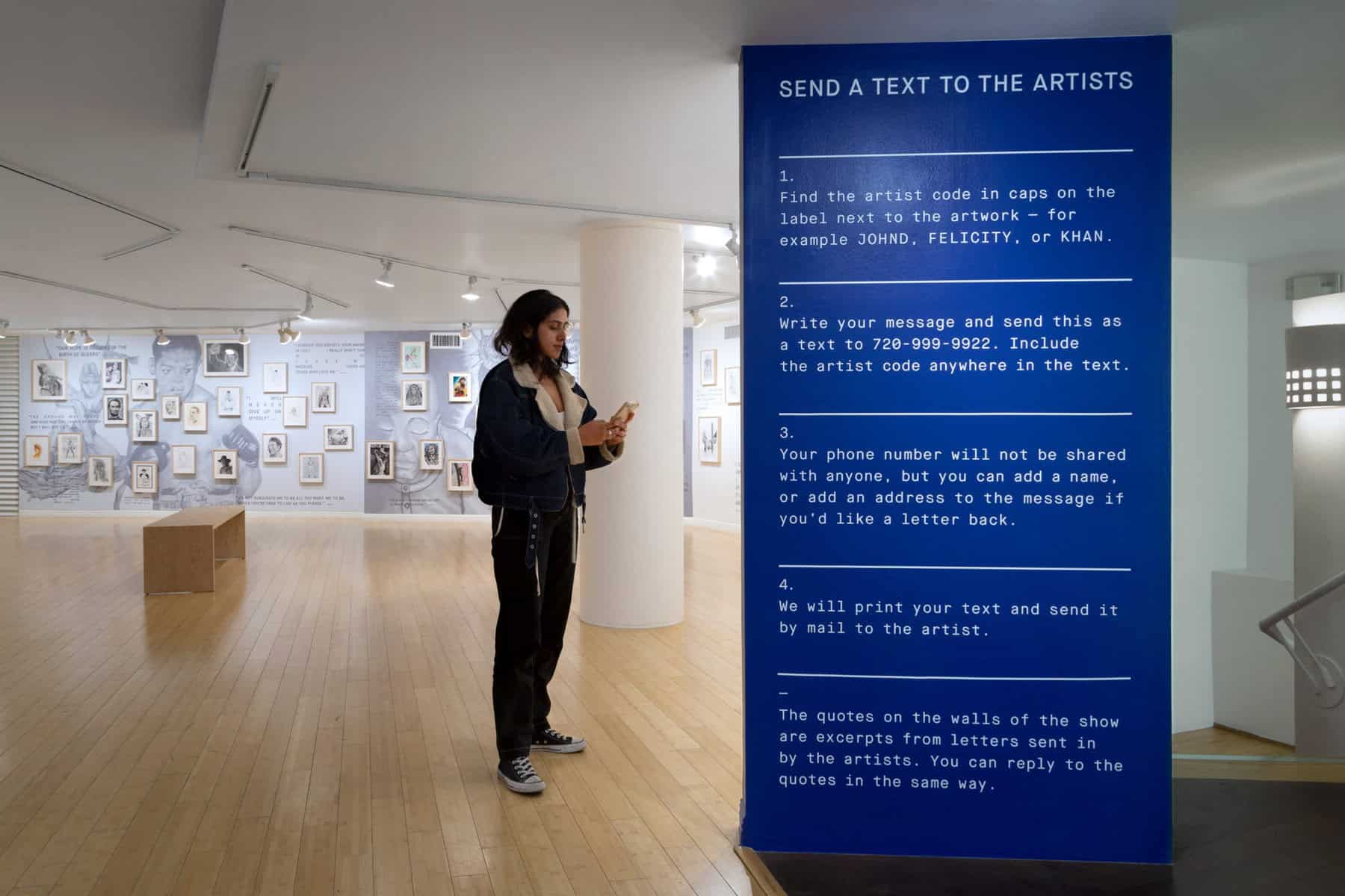 A major component of the exhibition is the ability to directly communicate with the artists via a texting and transcribing service created specifically for the exhibition, in addition to sending letters via the postal service. Accompanying each drawing is an artist code, which allows audience members to share their experience, thoughts, and feedback with each individual artist.