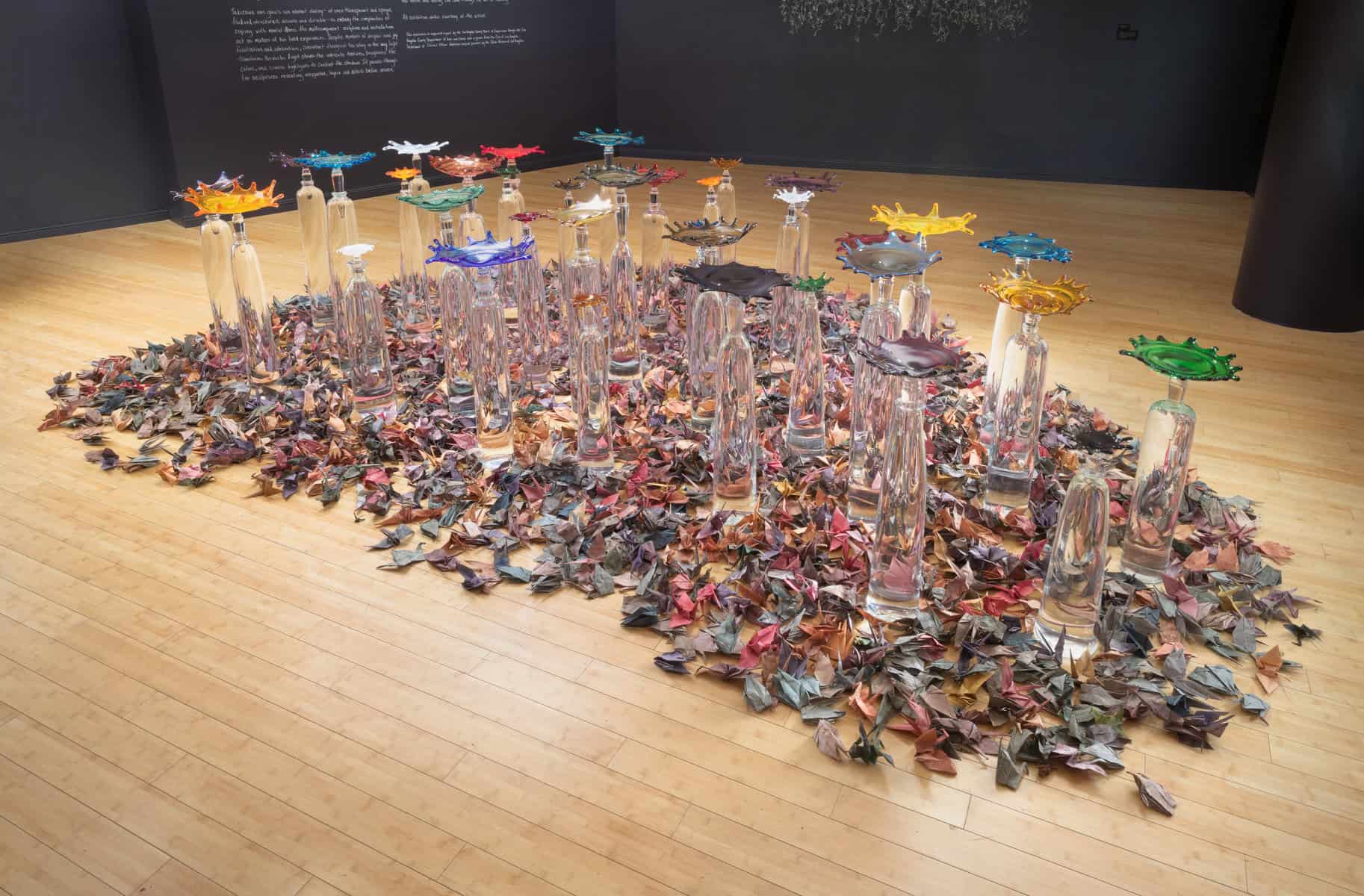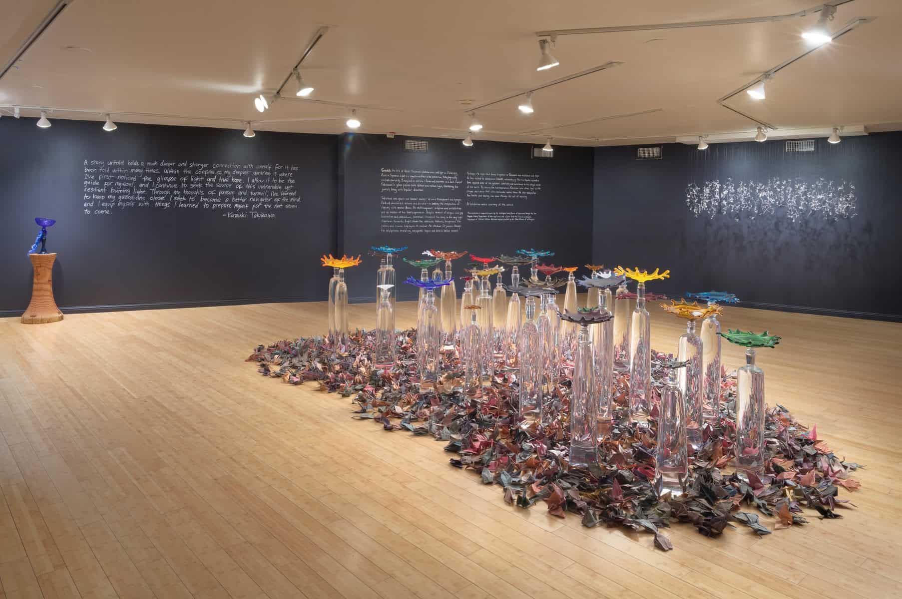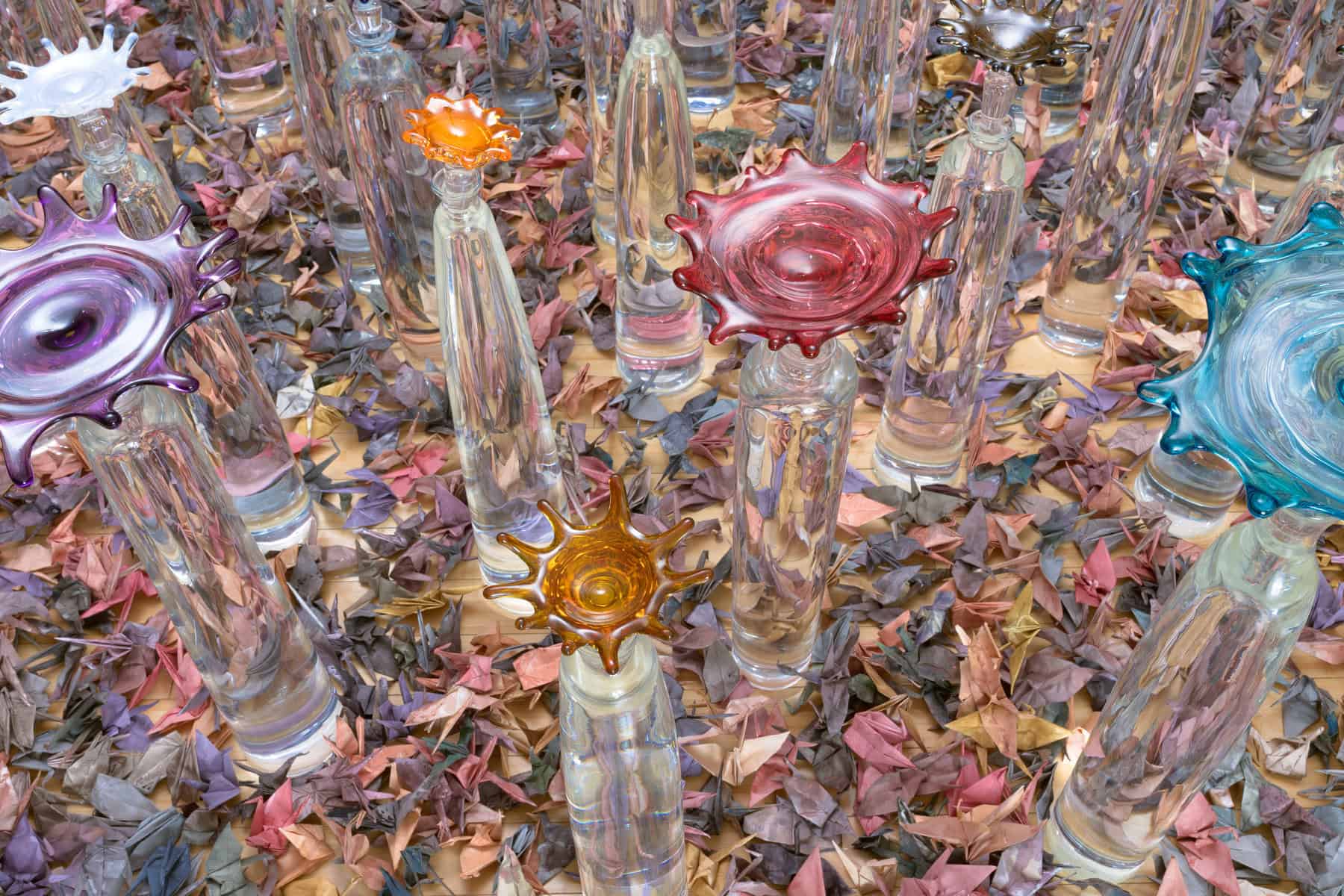 Takizawa uses glass’s own inherent duality — at once transparent and opaque, fluid and structured, delicate and durable — to embody the complexities of coping with mental illness. His multicomponent sculptures and installations act as markers of his lived experiences. Despite moments of despair and joy, frustration and celebration, consistent throughout his story is the way light transforms his works. The light shows intricate textures, brightens the colors, and creates highlights to contrast the shadows. It passes through his sculptures revealing unexpected layers and details that were previously unseen. For Takizawa, the forest alludes to his circuitous personal path with mental illness. The metaphor not only describes the deep obscurity of depression, but also acts as a reminder that through the darkness shine tomoshibi, or little lights, that guide the way forward.