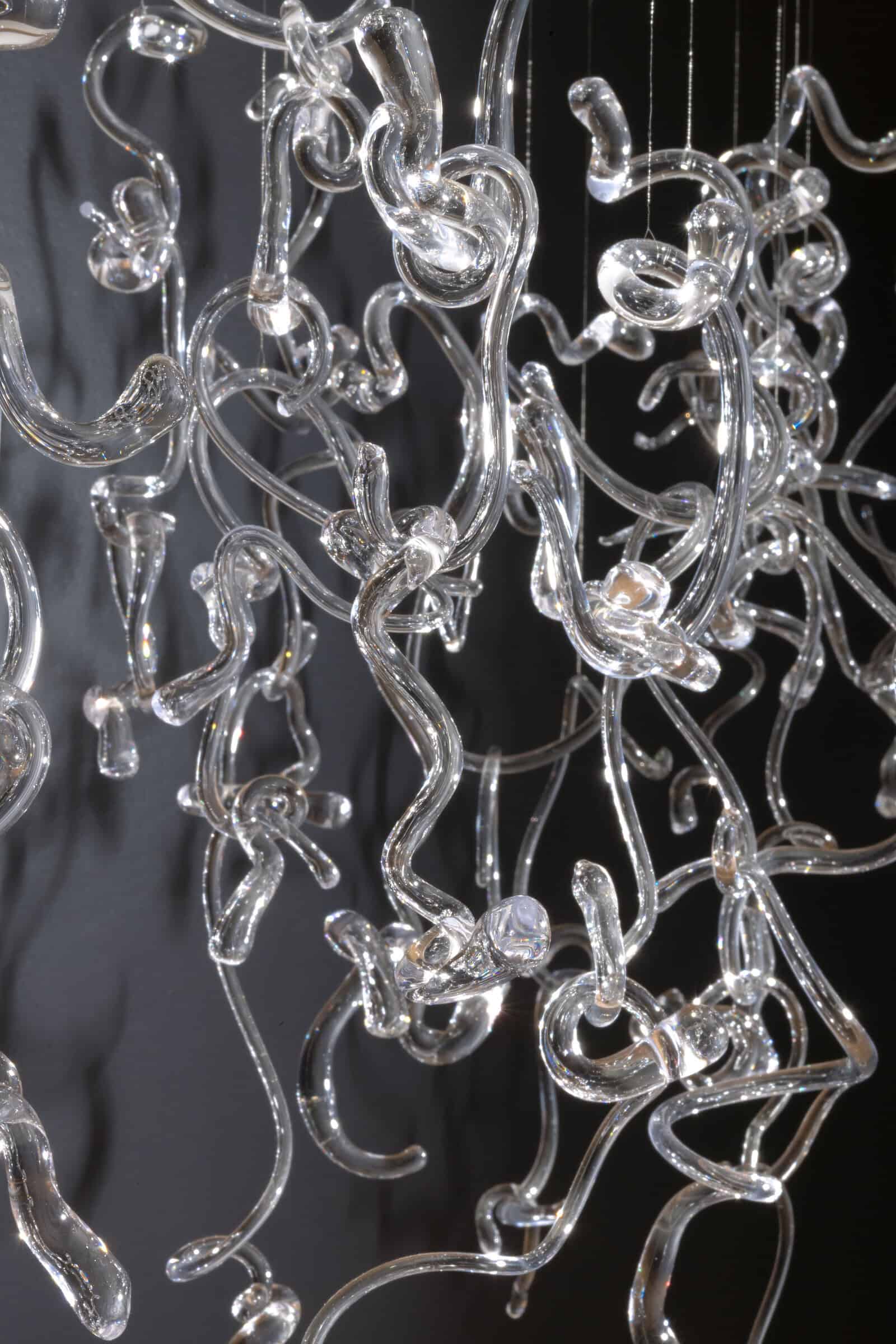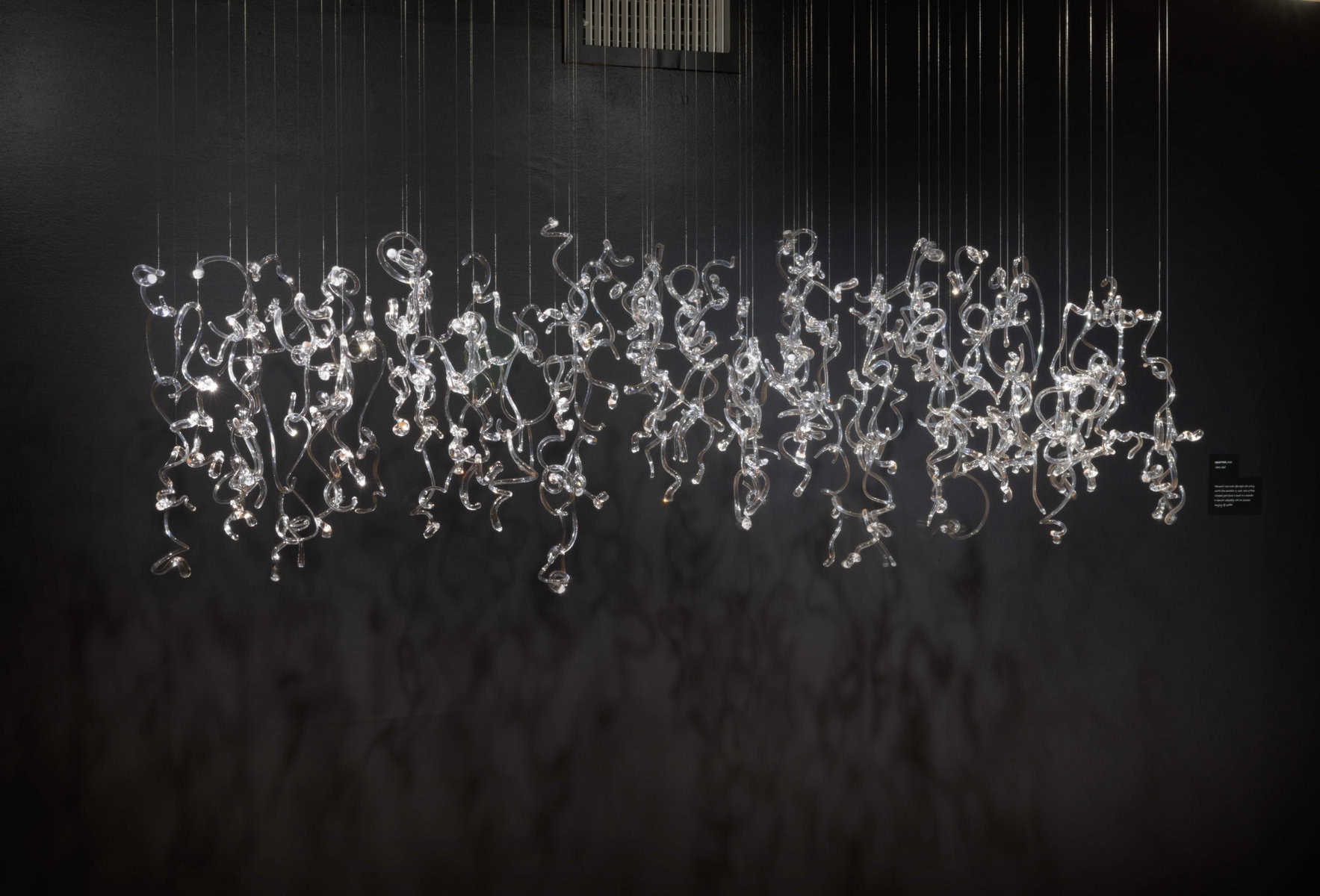 Tomoshibi, the title of Kazuki Takizawa’s exhibition, means small light or flickering flame in Japanese. Light is a significant force in his exhibition, both physically and metaphorically. Imagined as natural forms and creatures in a dark forest, Takizawa’s glass pieces both refract and reflect light, illustrating his journey living with bipolar disorder. Here, the gallery space acts as a stage for Takizawa’s sculptures, utilizing light as both a visual and symbolic device.